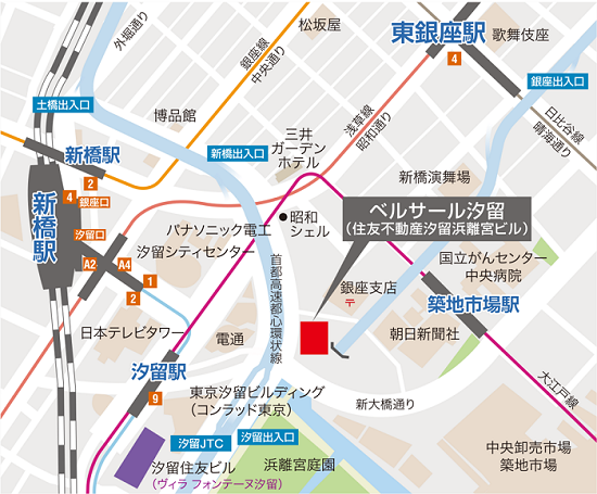 「汐留駅」徒歩5分(大江戸線、ゆりかもめ) 「新橋駅」徒歩8分(ゆりかもめ・JR線・銀座線・浅草線) 「東銀座駅」徒歩9分(日比谷線・浅草線) |