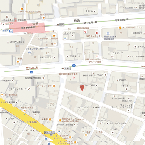 ![]() 地下鉄東山線「新栄町」2番出口より徒歩3分 |